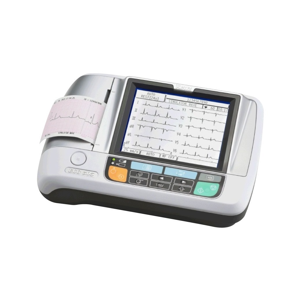 ELECTROCARDIOGRAFO Si hay un equipo electrónico que utiliza Enfermería continuamente es el electrocardiógrafo. El electrocardiógrafo es un aparato electrónico que capta, registra y amplía la actividad eléctrica del corazón a través de electrodos colocados en las 4 extremidades (pinzas Roja Negra, Verde y Amarilla y en 6 posiciones precordiales (rojo, amarillo, verde, marrón, negro y violeta) en el tórax. El registro de dicha actividad es el electrocardiograma (ECG o EKG, a partir del alemán Elektrokardiogramm) ) el cual se imprime en un papel especial el cual se encuentra incluido en el aparato. Es importante en el diagnóstico de enfermedades cardíacas y cardiovasculares. Ahí vamos a encontrar el clásico QRS y es ahí donde el cardiólogo detectará los ritmos normales (sinusal) o alterados (Fibrilación Auricular -FA-, Aleteo Auricular -Flutter-, Taquicardia Supraventricular -TSV-, Fibrilación Ventricular -FV-, Extrasístoles, Bradicardia, Bloqueos, WPW o Wolf Parkinson White, etc).