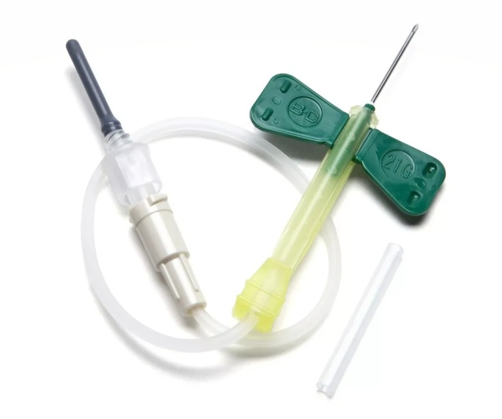 Aguja de doble punta: Un extremo se inserta en la vena del paciente y el otro, protegido por una funda de goma, perfora el tapón del tubo.